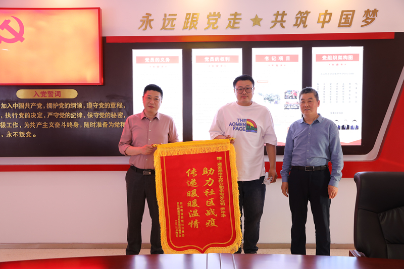 5月5日下午,新東街道新城社區居委會工作人員來到公司,為感謝公司黨員喬中華在該社區疫情防控期間守護居民群眾的健康安全,為打贏疫情防控阻擊戰發揮的積極作用,將寫有“助力社區戰疫 傳遞暖暖溫情”的錦旗送到公司黨委書記、總經理宋晟曄手中。