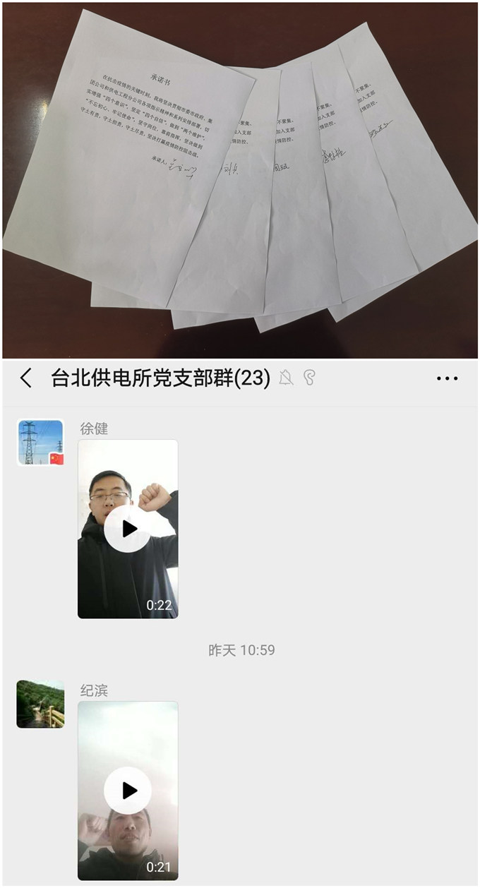 為充分貫徹落實(shí)黨中央關(guān)于打贏疫情防控阻擊戰(zhàn)的重要指示精神。2月13日,臺(tái)北供電所黨支部開展了“防控疫情,我們?cè)谛袆?dòng)”主題黨日活動(dòng)。該支部以“我是黨員我宣誓”、“疫情防控我承諾”、“我為疫情防控獻(xiàn)一策”系列活動(dòng),充分利用網(wǎng)絡(luò)直播平臺(tái)和微信APP,通過錄制個(gè)人宣誓短視頻、承諾書簽字、集體線上學(xué)習(xí)等方式方法,號(hào)召廣大黨員同志充分發(fā)揮黨員先鋒模范作用,在抗擊疫情的關(guān)鍵時(shí)刻,必須服從命令、聽從指揮;堅(jiān)守崗位、恪盡職守;堅(jiān)定信心、沖鋒在前;不忘初心,牢記使命;堅(jiān)決打贏疫情防控阻擊戰(zhàn)。(錢明華)