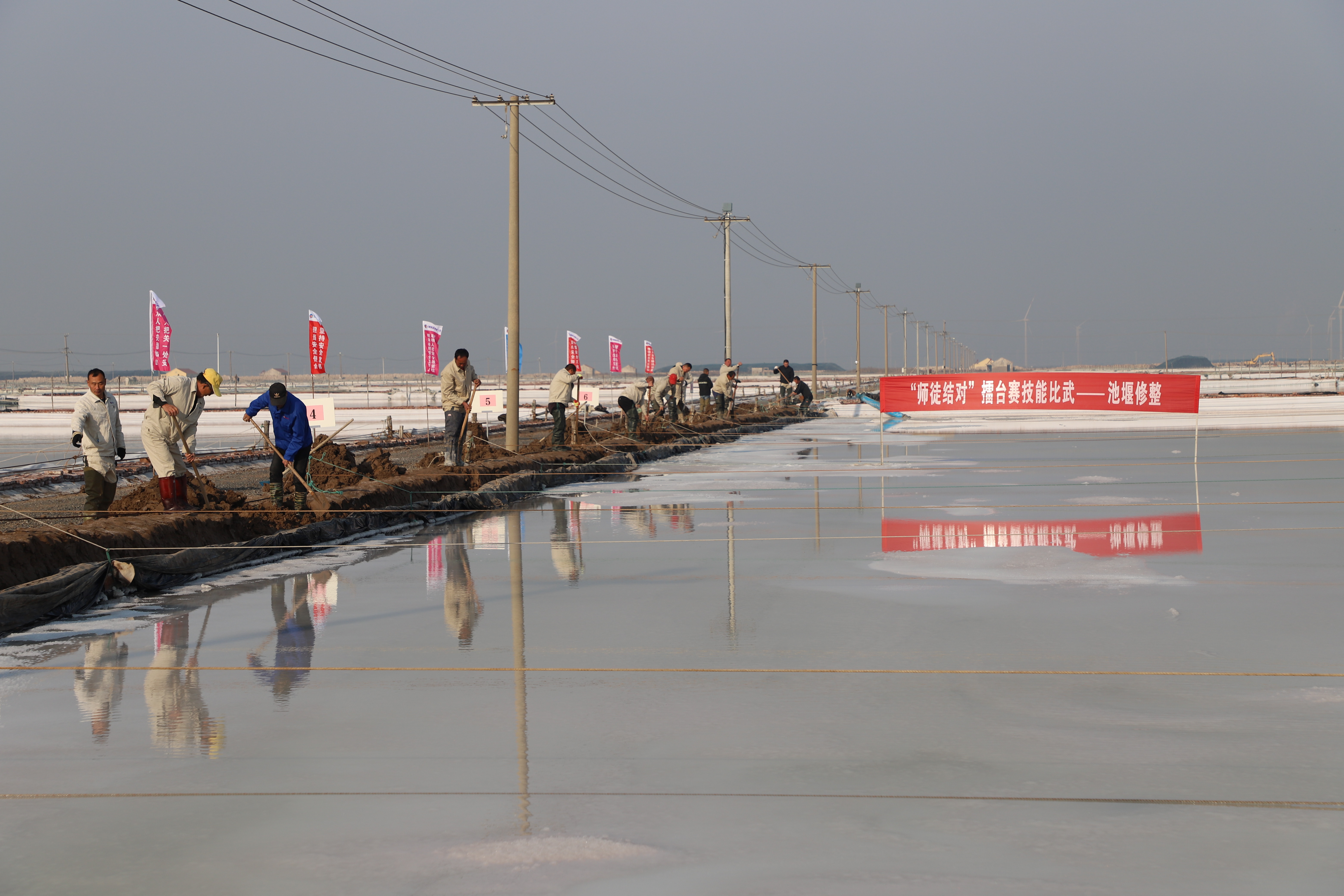 寒冬時節,暖陽之下,鹽廩之旁,曬得黝黑的鹽場產業工人們按照競賽的考核標準,做熟泥、打堰墻、做堰頂,護埝頂、夯埝坡、清塘底,見證了一場技能比拼的盛會。經過一天的鏖戰,盧正兵、靳新邦、匡洪忠師徒取得了池堰修整的前三名;林樹軍、潘成軍、胡繼華師徒取得了土塘清淤的前三名。(西工)