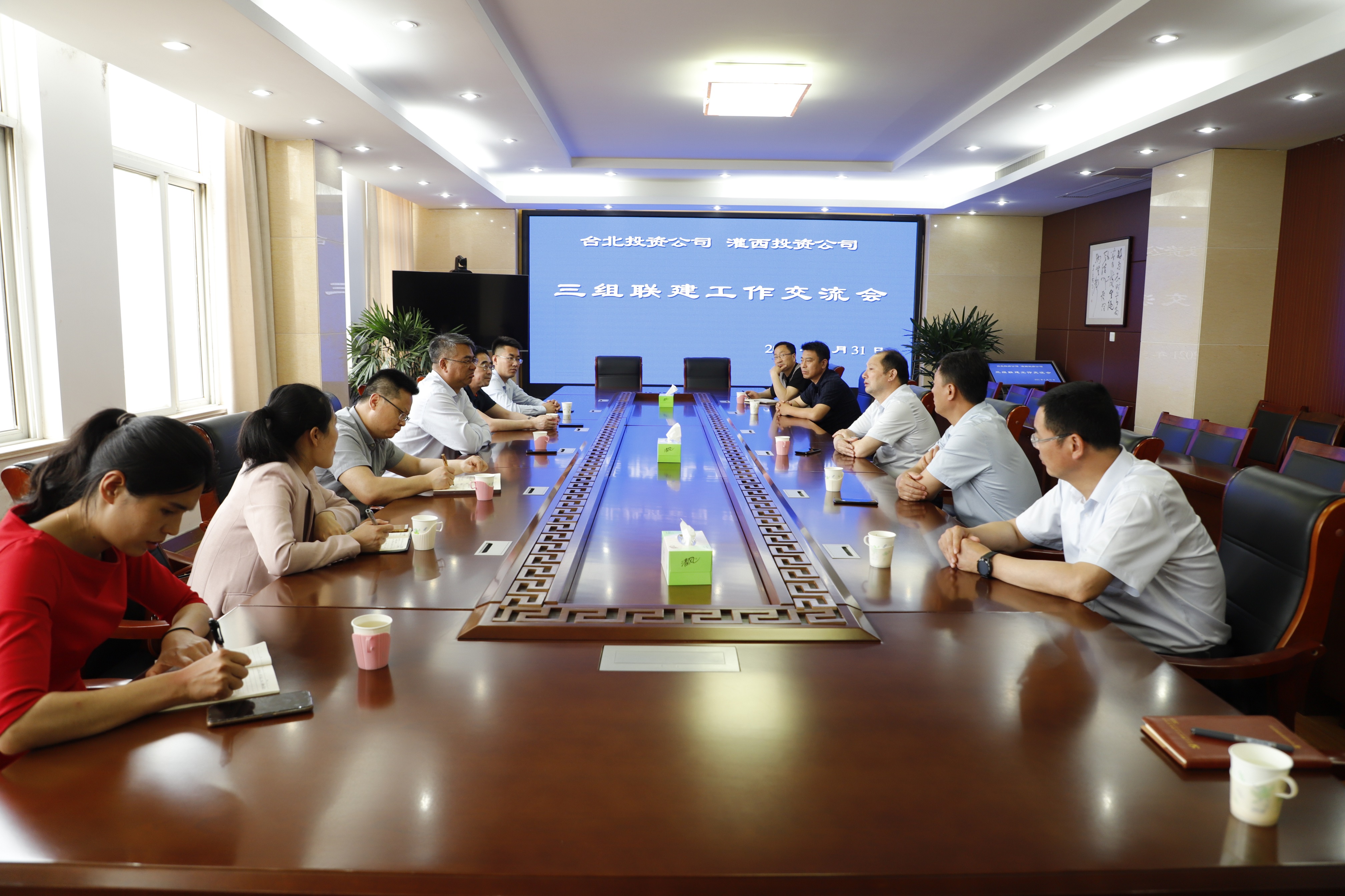 5月31日,臺北投資公司黨委書記、董事長、總經理王德志帶領三組聯建調研組來到灌西投資公司參觀交流。灌西投資公司黨委書記、董事長、總經理李國文、常務副總經理吳衛平、黨委副書記、工會主席王宏陪同參觀、座談
