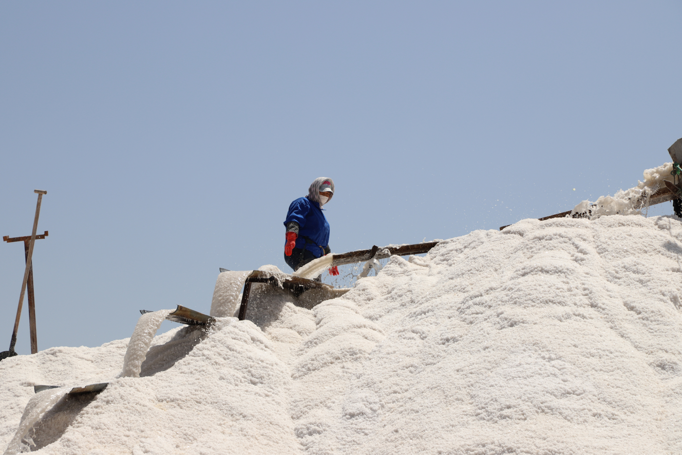 在新河十一班,扒鹽工作正在緊張的進行之中,兩名員工在鹽廩上揮舞著木鍬,搬送著淌鹽的導流板做鹽廩,扒鹽員工跟時間賽跑,24小時不停機3班倒開機扒鹽,緊緊抓住當前生產經營的黃金季節,搶抓扒鹽進度,堅決實現時間任務雙過半。