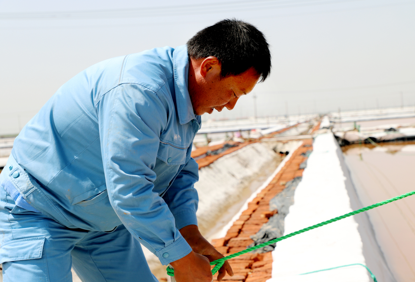 在新河的八班,員工有的在補塑料布,有的在疏通排水溝道,整理繩索,也是忙的熱火朝天。為了抓好二季度工作,八班以生產合格原料食用海鹽為目標,緊抓有利天時,進一步創新海礦鹵勾兌制鹽工藝,細化工作措施,責任到人,著力提升原鹽質量和產量,目前已生產海水鹽4000噸。