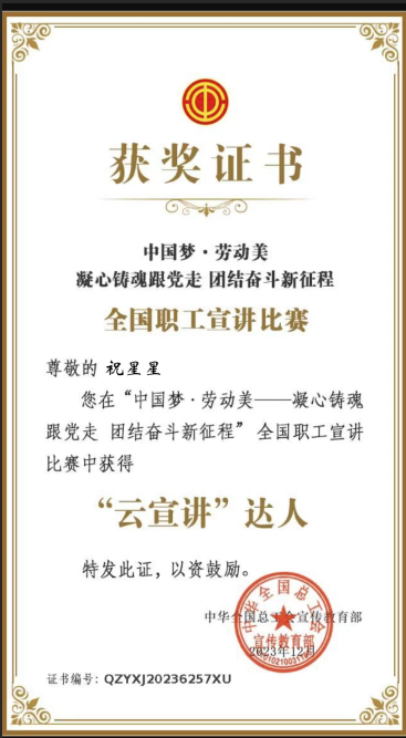 喜報:祝星星同志在全國總工會“云宣講”比賽中獲獎