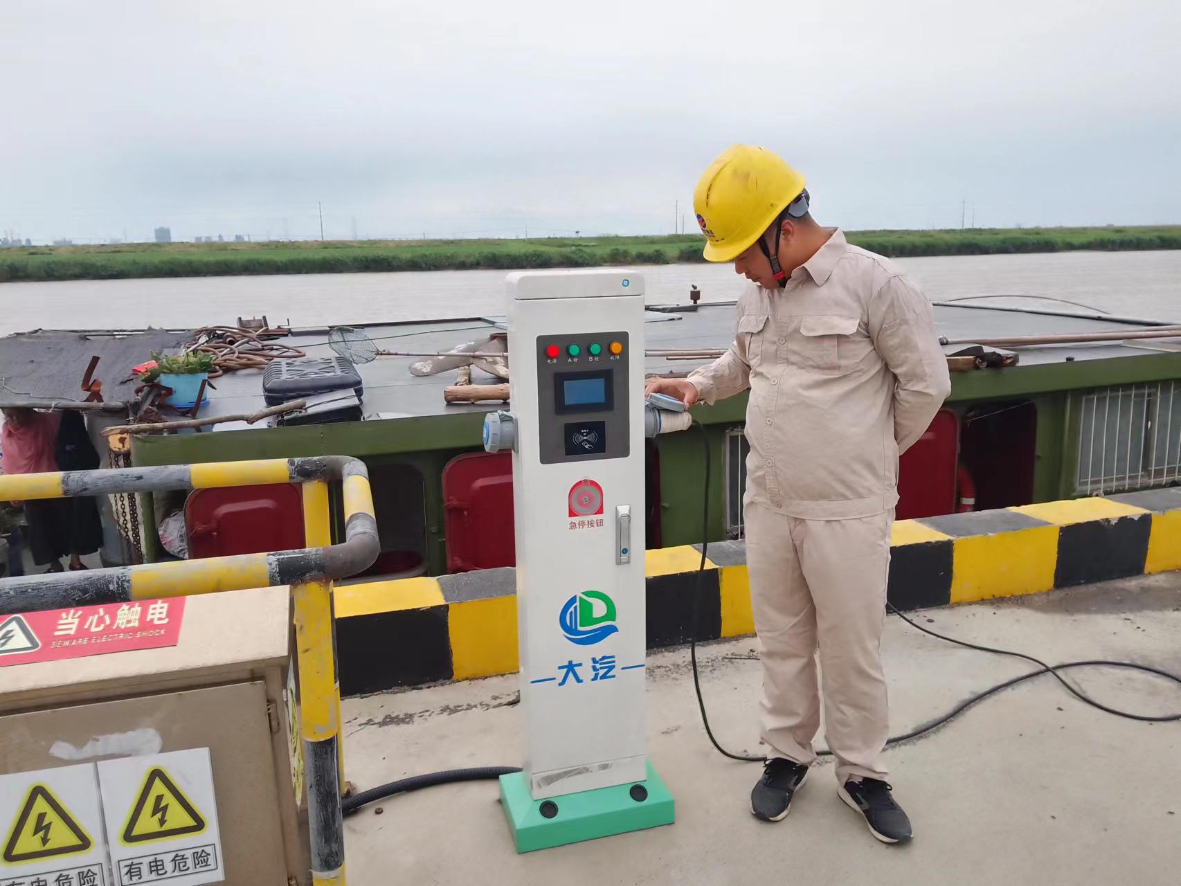 為了方便船只用上綠色環保電,宵洋物流公司在岸電基礎上進行升級改造,投資4萬余元,安裝5個岸電配電系統,以替代柴油發電,從而降低船只停靠時間,消耗廢氣排放和嗓聲污染,每個電樁上帖有操作說明書和注意事項等溫馨提示。接上專用電源,插入岸電接口,掃碼啟動即可使用,安全高效,降低安全隱患。