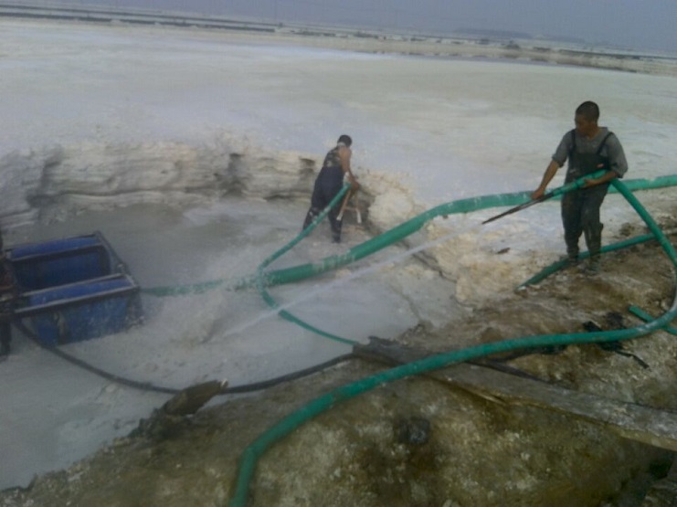 近日來,連續(xù)高溫酷暑天氣對日曬制鹽員工提出了生理挑戰(zhàn),新河制鹽廣大員工直面高溫,不畏酷暑,積極做好除硫工作,保證原鹽質(zhì)量。圖為除硫現(xiàn)場操作手緊握高壓水槍,對硫酸鈣沉淀區(qū)進行沖刷。(新河制鹽 邱利民)