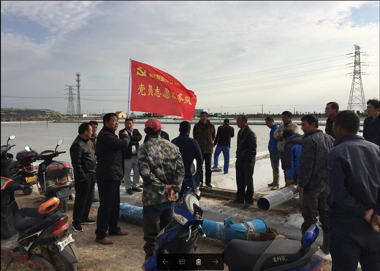 該公司八名黨員班長為展示支部黨員突擊隊作用,增強黨員標桿作用和服務意識,將鮮紅的支部黨員志愿服務隊旗插在了零班的灘頭。(新河制鹽 邱利民)