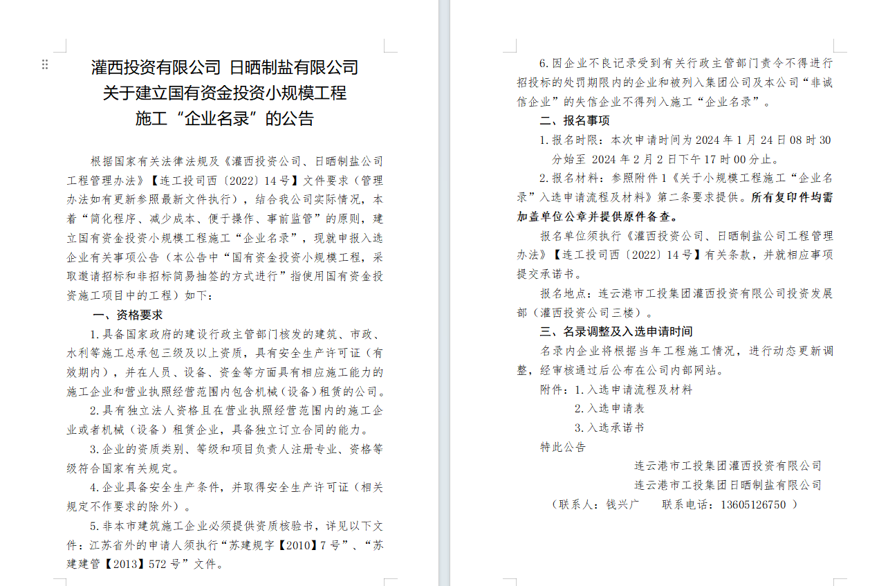灌西投資有限公司日曬制鹽有限公司關于建立國有資金投資小規模工程施工“企業名錄”的公告