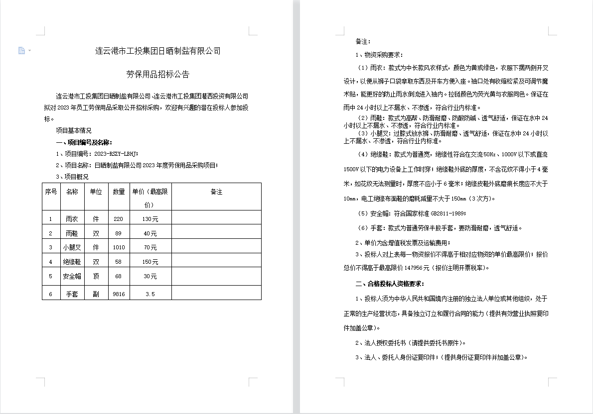 連云港市工投集團日曬制鹽有限公司勞保用品招標公告