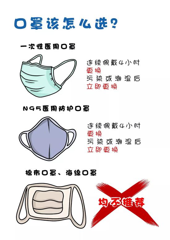 選擇二:去醫院看病或人群密集處可選用N95醫用防護口罩,連續佩戴4小時更換,污染或潮濕后立即更換。