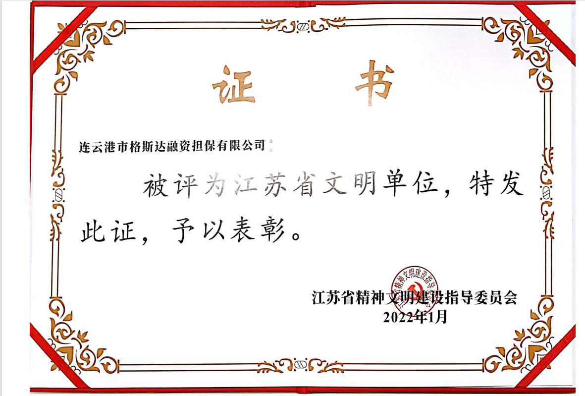 1月,格斯達(dá)擔(dān)保公司被省精神文明建設(shè)指導(dǎo)委員會(huì)評(píng)為“江蘇省文明單位”稱號(hào)。
