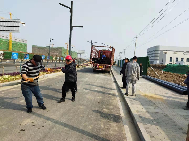 3月14日清晨,在金橋路管道施工現場,早已是人頭攢動、號子聲響,隨著一根根9米長的PE250管道被有條不紊的卸下車,金橋路鈣液管道遷建工程順利拉開序幕。