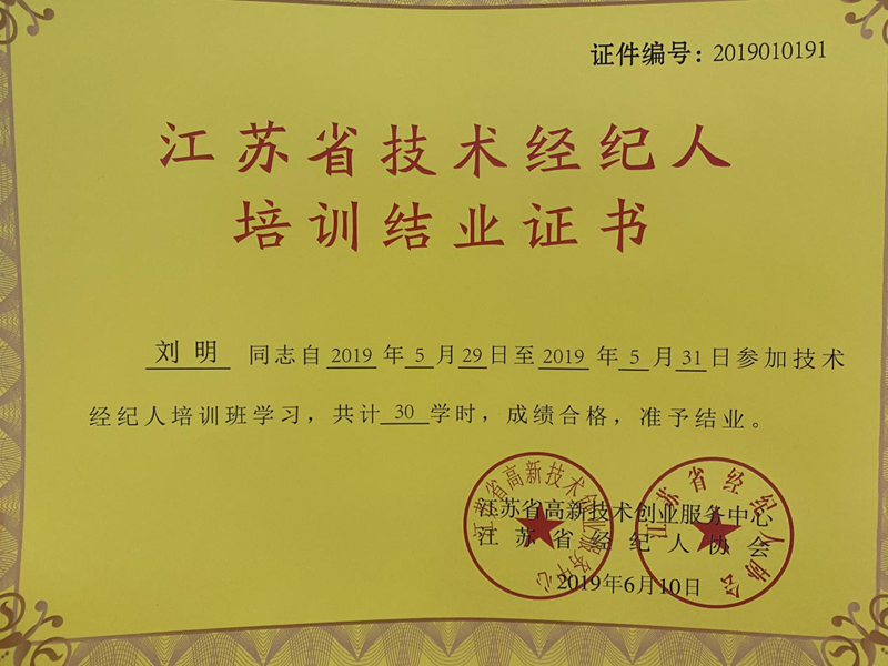 為提高公司服務質(zhì)量、豐富公司人才類型,美多利公司組織員工參加了江蘇省經(jīng)濟技術(shù)經(jīng)紀人培訓課程并獲得了培訓結(jié)業(yè)證書。