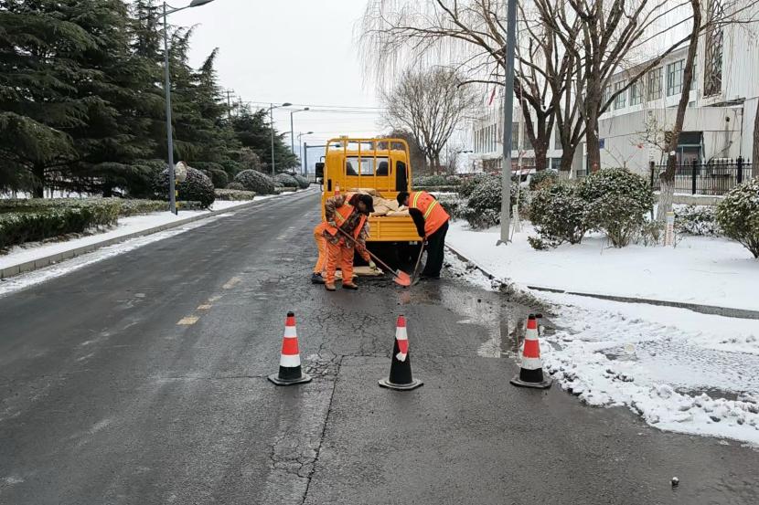 在排患工作中,盛達市政分公司安排2個“道路應急搶修小組”分頭行動,按照巡查組發現的情況,逐點對雪后道路坑窩等病害迅速展開搶修。考慮冬季氣溫低,不適合傳統熱瀝青修補方式,該公司為盡快解決安全通行問題,決定使用修補王、冷瀝青墊平等應急措施,先對道路坑窩、裂痕等進行臨時性維修,該公司在臨時修補完成后,還對維修點位建立了養護維修臺賬,以便事后巡查及養護,防止點位出現二次病害情況發生。