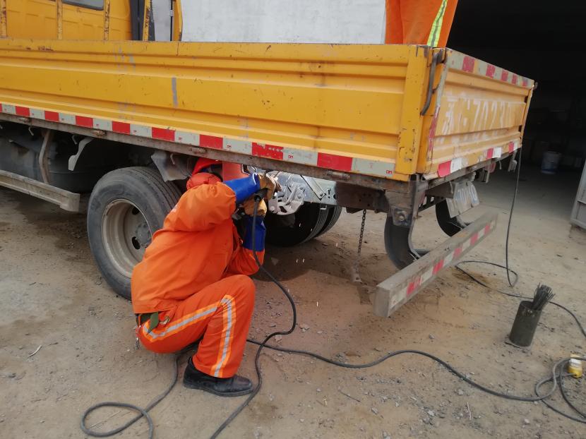 1月9日上午,經(jīng)過該公司設(shè)備維修班組再三斟酌,考慮如送修理廠維修,不但產(chǎn)生一筆不小的維修費(fèi)用,而且等待維修過程時間較長,影響工作進(jìn)度,為能給公司節(jié)省開支和不影響工作進(jìn)度,維修人員量好車廂底板尺寸后,將鐵板切割出需要的尺寸,一塊塊拼湊起來,加固在車廂底板上,通過半天的時間,順利為工具車底板披上一層合身、漂亮又特別的“盔甲”,有效延續(xù)了它的使用壽命。