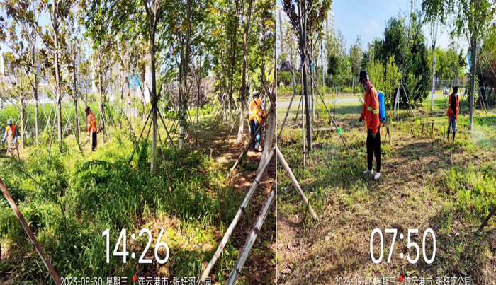 ? ? ? ?工作中,技術人員李傳武與管養班組長班長田恒亮、協管員葛承東奮戰在第一線,身先士卒,無懼高溫及蚊蟲叮咬,班組成員在其感染下,步調一致、步步為營,有序推進各項工程進度。經統計,在張圩港河公園100萬平方米草坪綠化帶上開展各類修剪10次、雜草反復清理近20次、病蟲害藥物消殺4次、新栽各類苗木600余株、清理枯死樹木300余株、對相關造型樹進行修型。在防汛抗旱維綠工作,采取白天人工澆水搭配晚間滴灌澆水的方法,確保綠綠植健康生長;暴雨后扶正傾倒樹木11余株,積極排澇2次……各項工作數據一路“飄紅”。